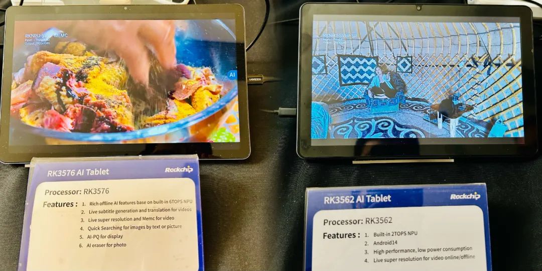 在消費電子展區(qū),展出了多款AI平板,分別采用RK3588S、RK3576、RK3562,支持AI-PQ/MEMC/SR及實時字幕展示和翻譯。RK3588S AI平板是目前國內(nèi)極為熱門的智能教育產(chǎn)品,集學(xué)習(xí)機、平板電腦及PC三合一,內(nèi)置有道AI助手 "Hi Echo" ,對教育模式產(chǎn)生顛覆式影響,大大提高教學(xué)效果及學(xué)習(xí)效率。