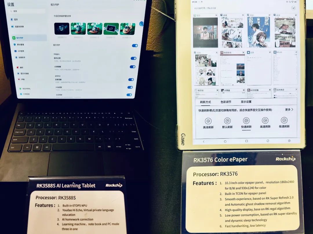 同時還有最新搭載RK3576的電子書產(chǎn)品和桌面機器人,電子書包括傳統(tǒng)黑白電子紙及彩色電子書,具有超低功耗、手寫低延時的優(yōu)勢,同時基于RK自研的Auto Clear和連續(xù)刷新算法,有效去除快刷殘影,相比傳統(tǒng)快刷方案,基于瑞芯自研的快刷算法,RK3576方案速度提升2.5倍,視頻播放幀率可達22fps,網(wǎng)頁滑動及閱讀翻頁絲滑流暢。