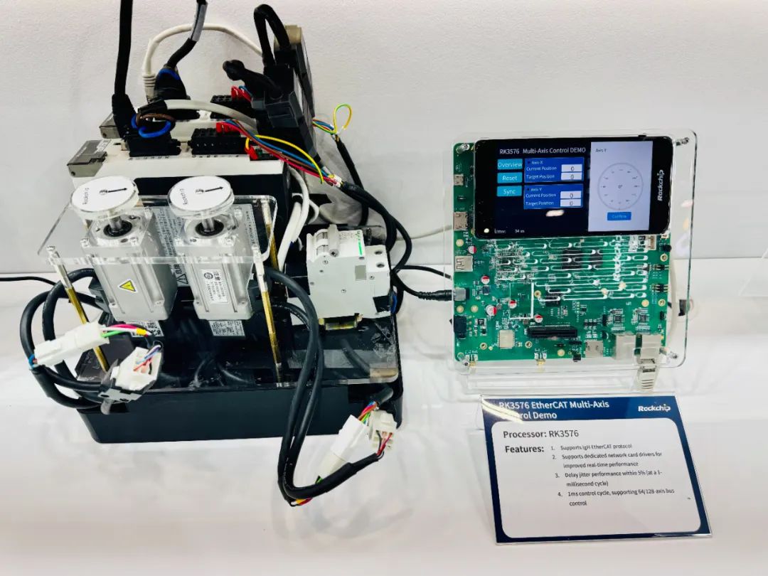 PLC方向,搭載RK3588J、RK3576J、RK3568J、RK3506J的EthercaCAT多軸控制、PCIe EP卡及PLC方案及應(yīng)用展出。基于RK3576J的多軸控制支持IgH EtherCAT協(xié)議,兼容主流工業(yè)設(shè)備如伺服驅(qū)動(dòng)器、I/O模塊,可適配專用網(wǎng)卡驅(qū)動(dòng),實(shí)時(shí)性更強(qiáng);延時(shí)抖動(dòng)性能達(dá)到5%以內(nèi)(周期為1毫秒),在1ms控制周期,可支持64/128軸總線控制,針對(duì)不同類型的運(yùn)動(dòng)控制場(chǎng)景的適用性更強(qiáng),適用于工業(yè)機(jī)器人、物流等應(yīng)用場(chǎng)景的設(shè)備升級(jí)。