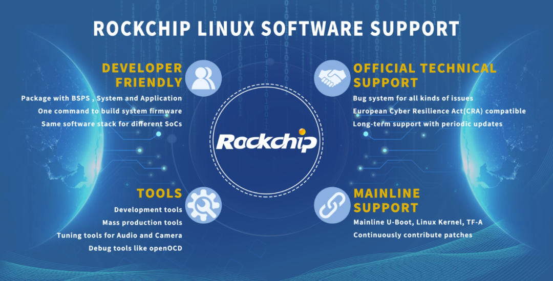 三、全面軟件保障,豐富生態(tài)資源匹配針對(duì)工業(yè)場(chǎng)景智能化,瑞芯微提供全面軟件保障支持,主流芯片平臺(tái)持續(xù)更新適配最新Linux及Android系統(tǒng)版本,為全球開發(fā)者提供 BSP、系統(tǒng)與應(yīng)用一體化軟件包,各領(lǐng)域合作伙伴及開發(fā)者均可在瑞芯微官方平臺(tái)獲得全類型問題的技術(shù)支持以及各類開發(fā)調(diào)試工具。在安全支持方面,瑞芯微提供全鏈路的安全啟動(dòng)SecureBoot、Trustzone、加解密引擎等全面的安全保障機(jī)制,防止固件完整性被篡改。