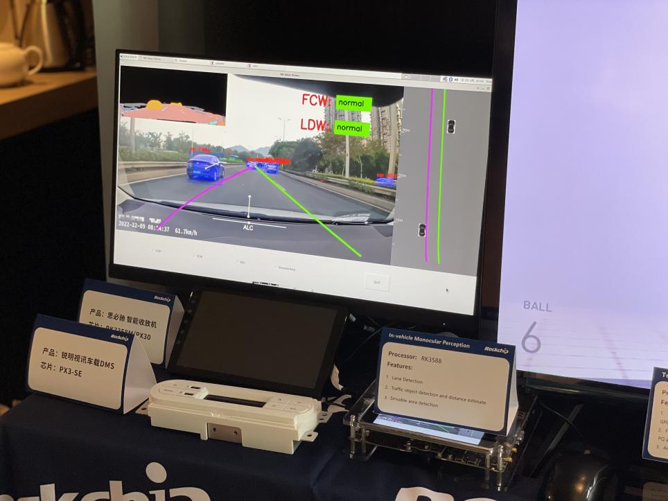 In the automotive electronics exhibition area, various in-vehicle products equipped with Rockchip solutions are displayed, covering passenger vehicle, commercial vehicle and smart cockpit. The RK3588 chip embedded with ADAS algorithm can identify the vehicle distance, road distance and recognize objects during driving, so as to realize obstacle avoidance and a 360-degree surround view. Applications such as the central control screen installed with RK3358M were also displayed.
